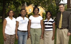Courtney Hayes (second from left), who plans to attend Stillman College, Brittany Montgomery (center), who will attend Tuskegee University, and Valencia Barnes (second from right), who will attend The University of Alabama, all May 2004 high school graduates from Dallas County, are pictured with Cynthia Moore (far left), assistant director of the UA Rural Health Scholars Program, and Dr. John Wheat (far right), professor of community and rural medicine in the UA College of Community Health Sciences.