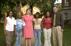 Lowndes County students (second from left to right) Tiffany Watson, Stephanie Jordan and Genesis Taylor, all seniors at the Calhoun School, and Anna Kate Davis, a senior at Fort Dale Academy, pictured with Cynthia Moore (left), assistant director of the UA Rural Health Scholars Program, and Dr. John Wheat (right), professor of community and rural medicine in the UA College of Community Health Sciences.