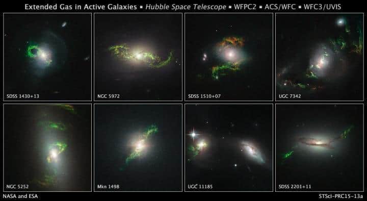IN 2007, A Dutch schoolteacher named Hanny var Arkel discovered a weird green glob of gas in space. Sifting through pictures of galaxies online, as part of the citizen science project Galaxy Zoo, she saw a cloud, seemingly glowing, sitting next to a galaxy. Intrigued, astronomers set out to find more of these objects, dubbed Hanny’s Voorwerp (“Hanny’s object” in Dutch). Now, again with the help of citizen scientists, they’ve found 19 more of them, using the Hubble space telescope to snap the eight haunting pictures in the gallery above … What causes these wispy tendrils of gas to glow? … Beaming out from the galaxy, that ultraviolet radiation strikes nearby clouds of gas, left over from past collisions between galaxies. And it makes the clouds glow an eerie green. “A lot of these bizarre forms we’re seeing in the images arise because these galaxies either interacted with a companion or show evidence they merged with a smaller galaxy,” says William Keel, an astronomer at the University of Alabama, Tuscaloosa.
